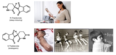 Hoặc thuốc Thalidomide (một biệt dược được sản xuất tại Đức, rất nổi tiếng trên thị trường khi được đưa vào sử dụng năm 1957) được mệnh danh là “thần dược” cho phụ nữ mang thai để điều trị những triệu chứng chóng mặt, mất ngủ, buồn nôn trong giai đoạn ốm nghén. Tuy nhiên, kể từ năm 1961, Thalidomide đã bị cấm sản xuất và lưu hành sau khi hàng nghìn bà mẹ sử dụng loại thuốc này sinh ra những đứa trẻ bị dị tật, gọi là “hội chứng chim cánh cụt”. Thuốc tổng hợp cũng tạo ra 2 đồng phân quang học, gồm: R – thalidomide gây cảm giác thoải mái, không buồn nôn, ăn ngon, ngủ ngon; trong khi, đồng phân S – thalidomide lại gây tác hại rất nghiêm trọng, đứa bé sinh ra có hiện tượng các chi không hoặc kém phát triển (hình 1).