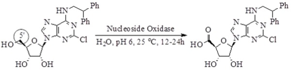 Điển hình như tổng hợp dẫn xuất 5’ – carboxylic acid bằng phương pháp hóa học thường gặp khó khăn do gốc acid được hình thành ngẫu nhiên ở vị trí OH 2’, 3’ hoặc 5’, để phản ứng chỉ tạo dẫn xuất 5’ – carboxylic acid cần phải bảo vệ các nhóm OH 2’ và 3’ trong cấu trúc trước khi thực hiện phản ứng. Nhưng khi tổng hợp dẫn xuất này bằng nucleoside oxidase (chiết xuất từ Stenotrophomonas maltophilia) cố định trên giá thể Eupergit – C thì việc tổng hợp trở nên dễ dàng mà không cần phải bảo vệ gốc OH 2’ và 3’ trong cấu trúc (hình 3).
